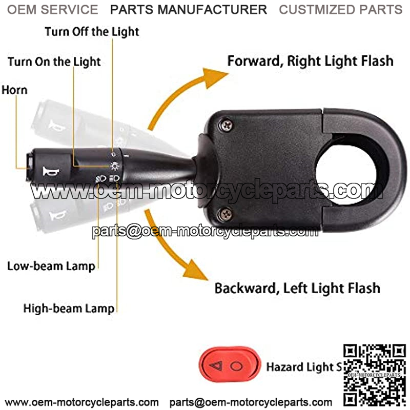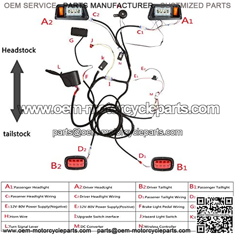 Kit includes: 2* LED front headlight, 2* LED taillight, 1* horn, 1* turn signal lever with headlight/horn switch, 1* steering column cover, 1* brake pad, 1* plug & play wiring harness, 1* screw set, 1* installation instructions