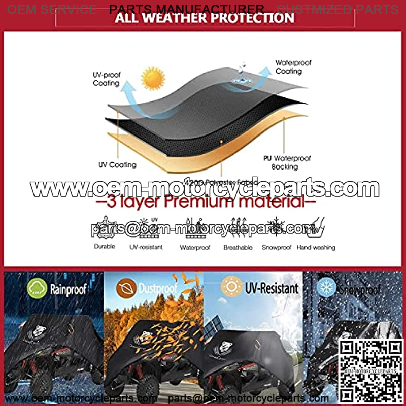 DURABLE MATERIAL THAN OTHERS–ClawsCover UTV covers made of heavy duty 420D polyetser oxford cloth with waterproof PU coating and UV-Resistant coating in backing,Better than 190T,210D,300D polyester oxford cloth,which is waterproof,windproof,uv protection,fadeless,anti-aging tearproof,rainproof,sunproof,dust proof,snow proof.