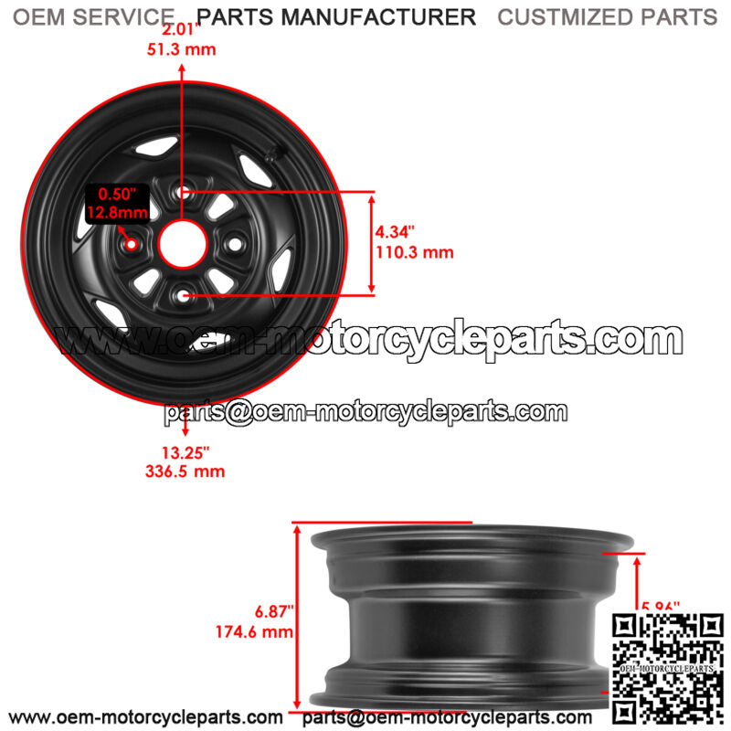 Bolt Pattern : 4x110Backspacing : 6inHub Bore : 51.3mmWheel Construction : One Piece CastWheel Style : 6 SpokeWheel Diameter : 13.25″
