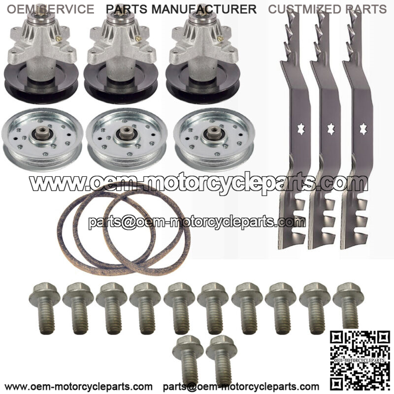 Kit Includes: (3) Spindles, (3) Mulching Blades, (3) Pulleys, (1) Belt
