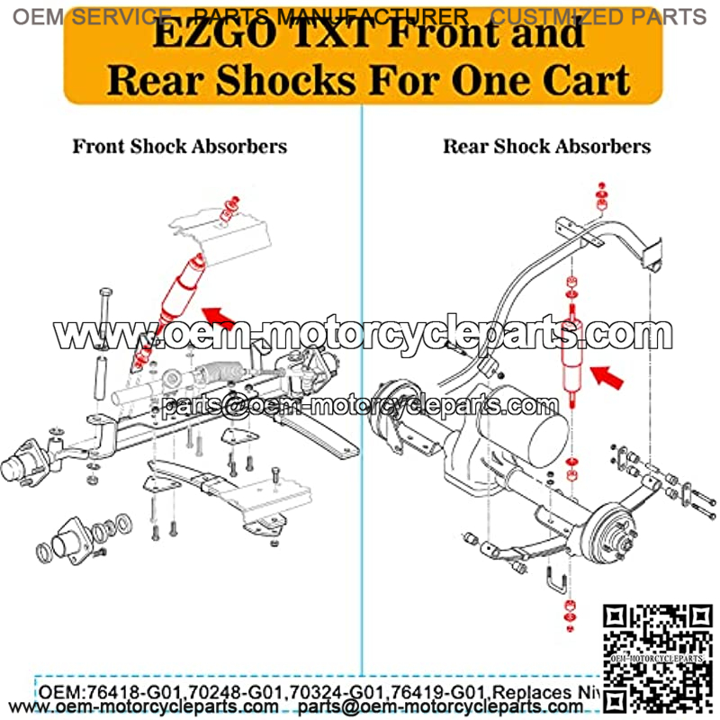 ??OEM NUMBER??EZGO TXT Shock Front and Rear Shock Absorbers Replaces OEM #76418-G01, 70248-G01, 70324-G01, 76419-G01, Replaces Nivel #5006. All Bushings are Included.