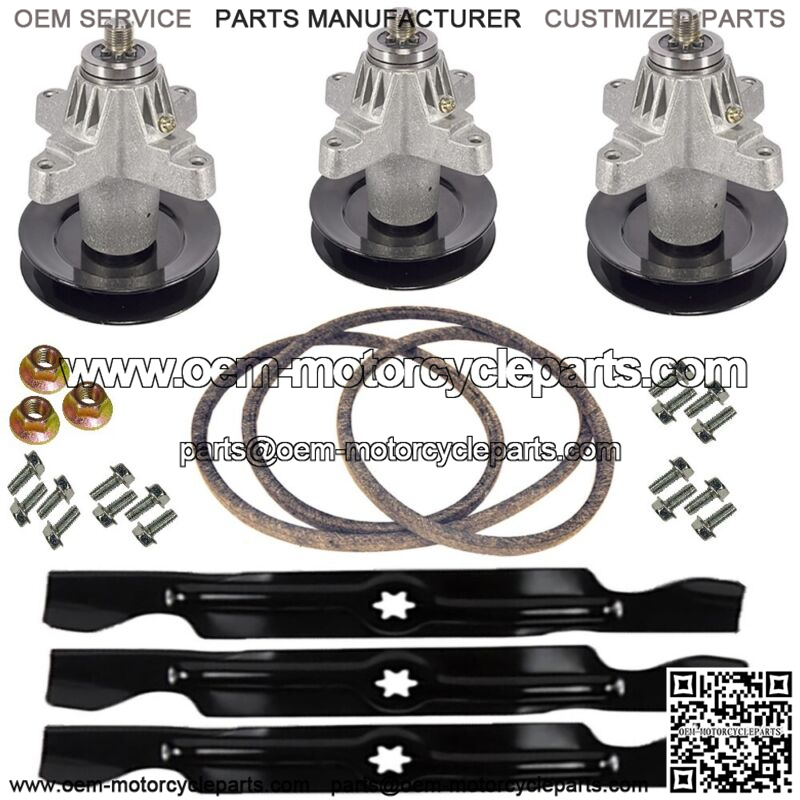 (3) 2-in-1 Mower Blade, (3) Spindle Assembly, (3) Spindle Blade Nut, (1) Belt, (12) Thread Cutting Bolt