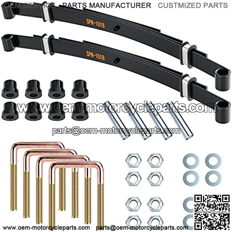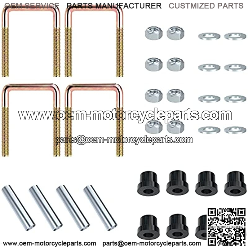 Kit includes: 2 * heavy duty 4-leaf rear springs, 8 * rubber bushings, 4 * metal spacer 70289-G02, 4 * U bolts 72618-G01