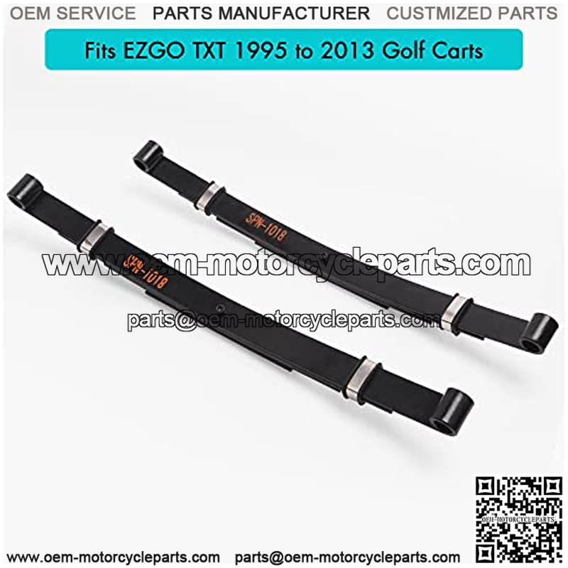Fits EZGO TXT 1995 to 2013 Golf CartsIncludes (8) Rubber (Not Imitation) Bushings & (4) Stainless Sleeves & (4) U-bolt nuts. Bushings & Sleeves are pre-installed in the springs. High Quality: rear carbon steel leaf spring kit made with heavy duty stiff springs and anti-rust coating, they’re much thicker than most OEM and aftermarket springs;Easy Installation: Our Leaf bushing kit has already been Semi-Installed. People could finish the installation by themselves alone with some basic hand tools, very easily.