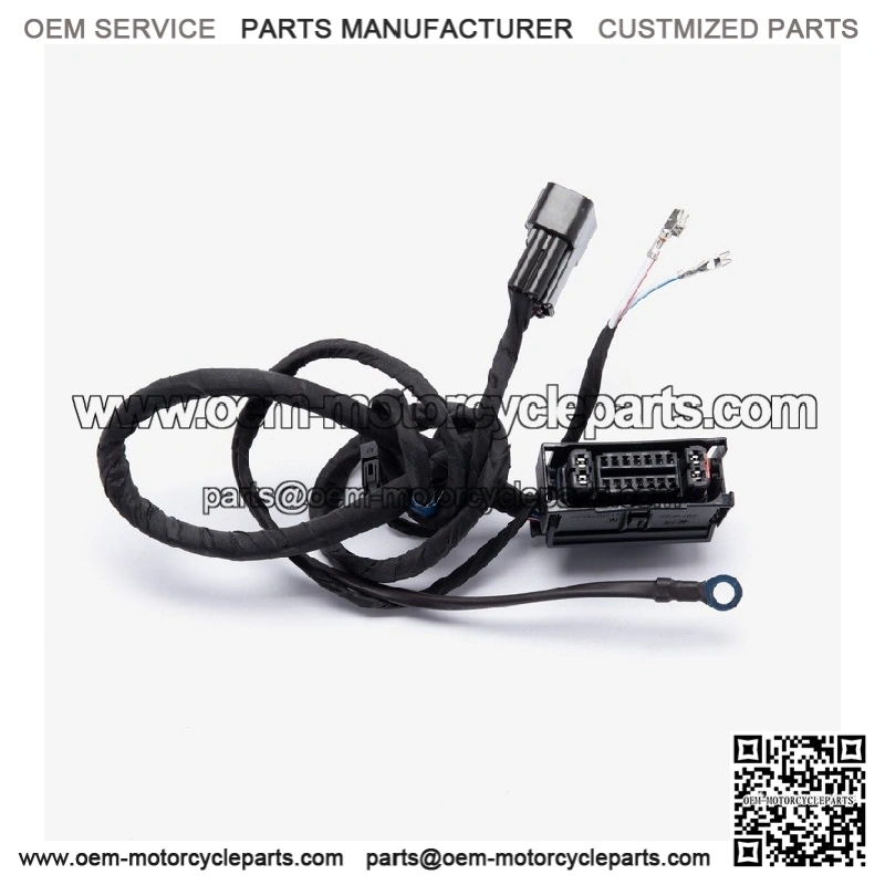 A motorcycle wiring loom, also known as a wiring harness, is a bundle of wires and connectors that transmits electrical power and signals throughout the motorcycle. It organizes and protects the electrical wiring, ensuring connections between components such as the ignition system, lighting, and various sensors. The loom is typically wrapped in protective sheathing to guard against wear and damage, and is designed to streamline installation and maintain a neat, efficient electrical system.