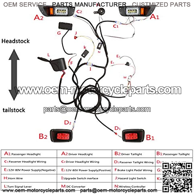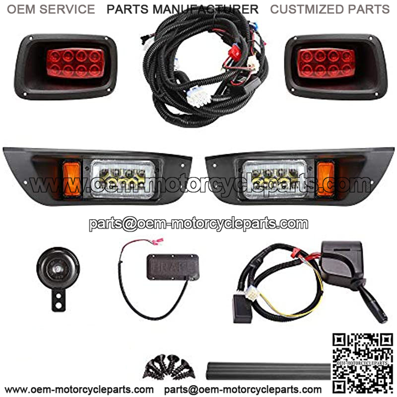 Kit includes: 2* LED front headlight, 2* LED taillight, 1* horn, 1* turn signal lever with headlight/horn switch, 1* steering column cover, 1* brake pad, 1* plug & play wiring harness, 1* screw set, 1* installation instructions
