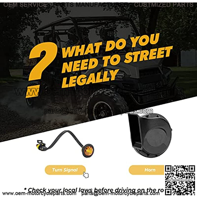 Legal on the road : – What accessories do you need when you want your vehicle to be road legally Essential among them are turn signals and horns which help you get a step closer street legally. Warm Tips: State and local laws are different from street legal UTV. Check your local laws before driving on the road.