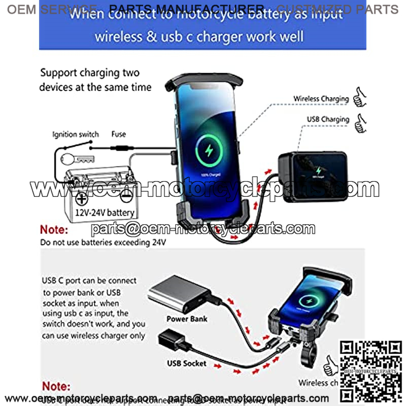 This motorcycle phone mount with wireless and USB C dual charger: When connect to motorcycle battery as input, both wireless & USB C charger work well. Support simultaneous fast charging of two compatible digital devices. The motorcycle phone holder wireless output 15W max, USB C output 20W max.